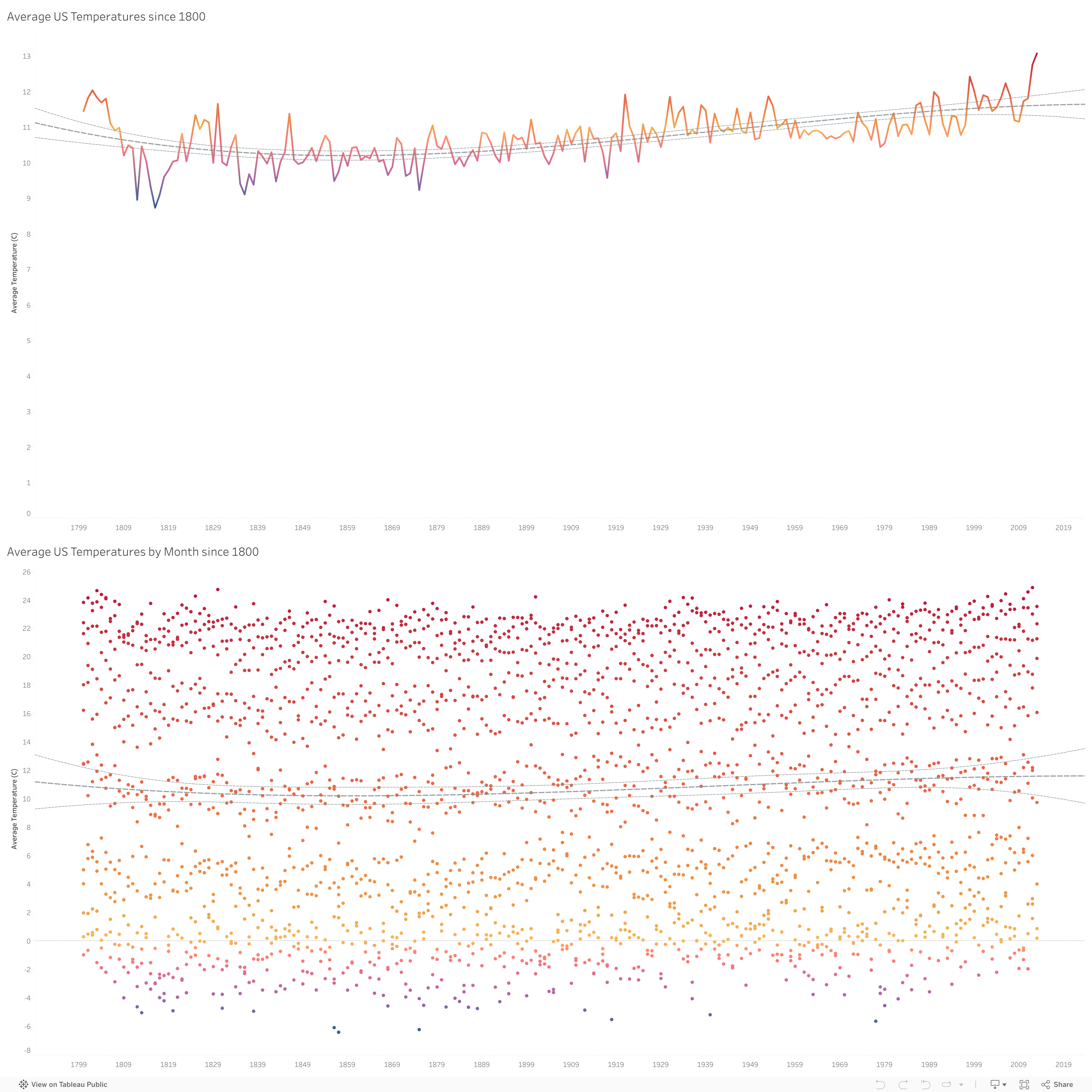 A rather sensational visual to start the year. A simple look at average temperatures (in Celsius) in the US since 1800. There is a polynomial trend line for the average, and you can make the obvious inference. This data comes from data.world using the Global Land Temperatures By City data, and filtered down to the US from 1800