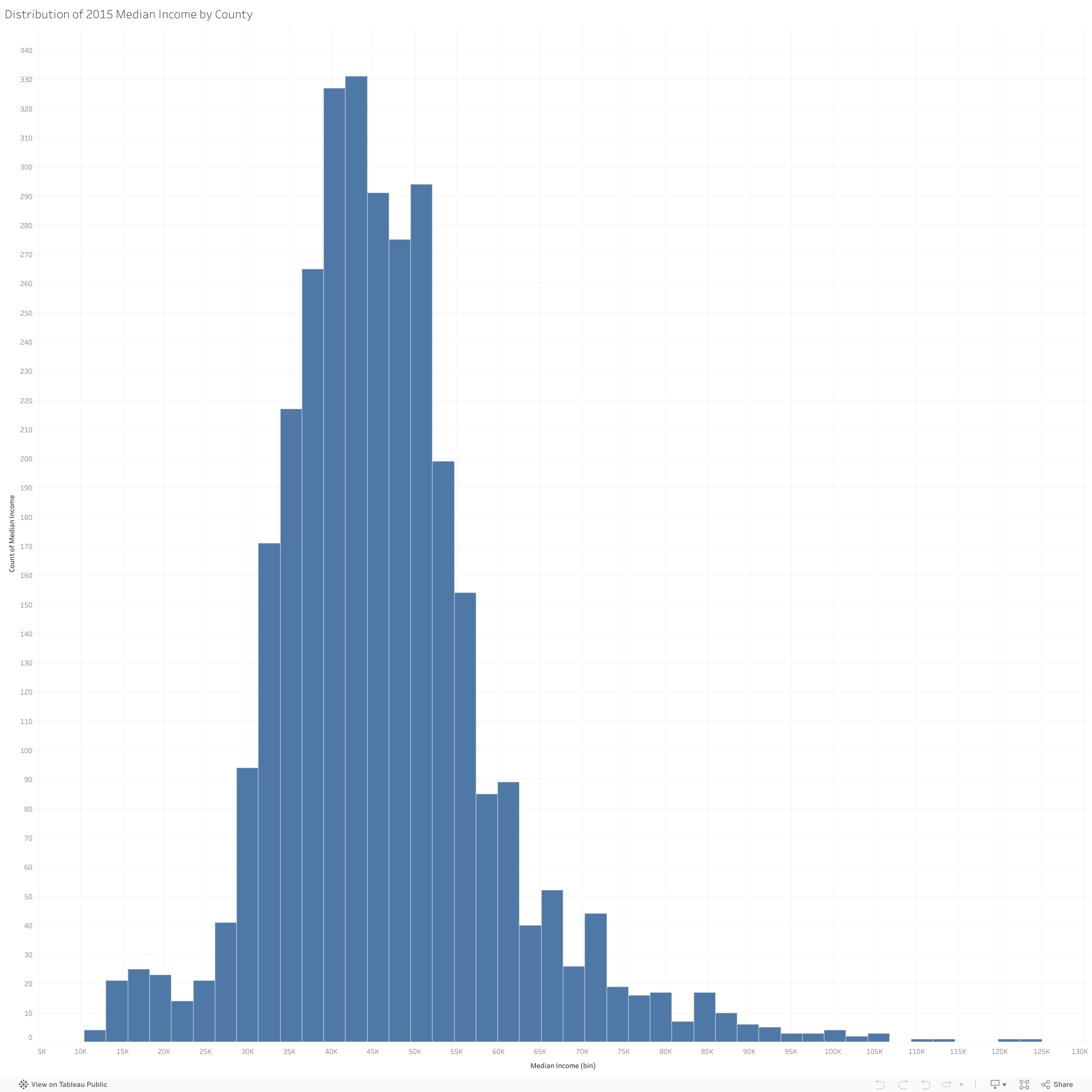 Distribution of Median Income across US Counties in 2015. Details are shown for Median Income by County. The data comes from the Fact Finder of the US Census.